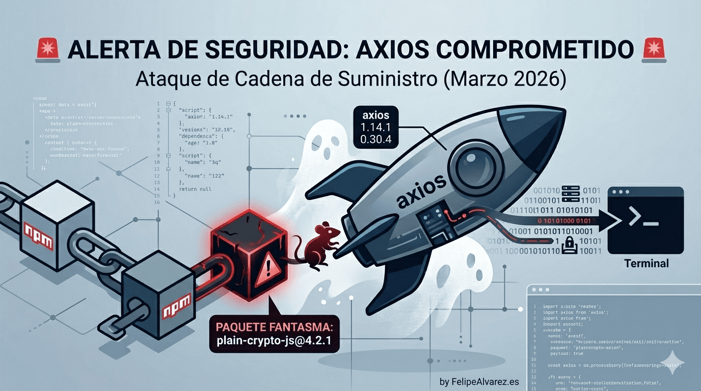 El ecosistema de JavaScript ha sufrido uno de sus golpes más significativos de los últimos años. Axios, la librería cliente HTTP con más de 100 millones de descargas semanales, fue comprometida en el registro oficial de npm. No se trató de un error de código, sino de un ataque de cadena de suministro (Supply Chain Attack) dirigido.